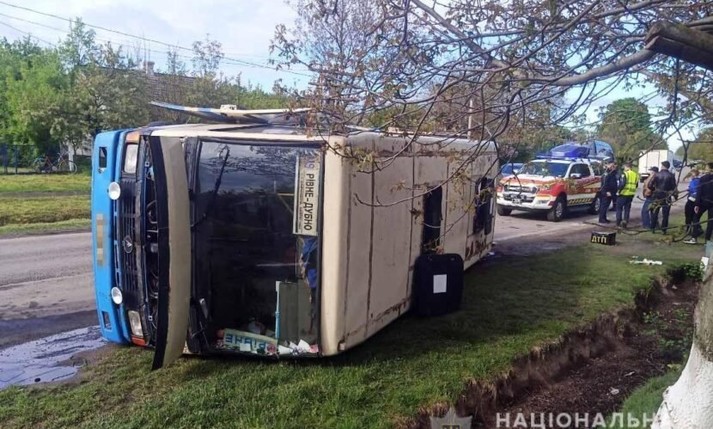 У селі Мирогоща Рівненської області внаслідок невдалого маневру з уникнення зіткнення з легковим авто перекинувся пасажирський автобус з 20 пасажирами, чотирьох з них госпіталізували. Про це повідомляє пресслужба Національної поліції Рівненської області.