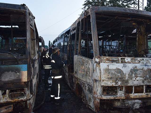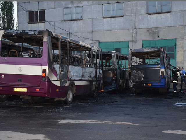 Пожежу на площі 100 кв. м було ліквідовано о 04:30. Вогнем було знищено шість автобусів «Еталон». Причина загорання наразі встановлюється.