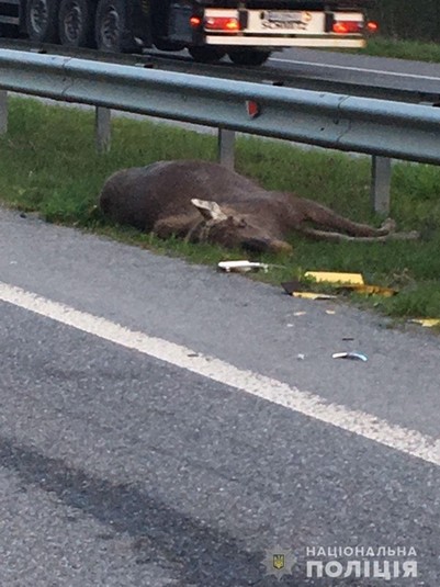 «Попередньо встановлено, що водій автомобіля DAF з напівпричепом, рухаючись в напрямку Житомира, на заокругленій ділянці дороги наїхав на лося, який раптово вибіг на проїжджу частину», - йдеться в повідомленні.