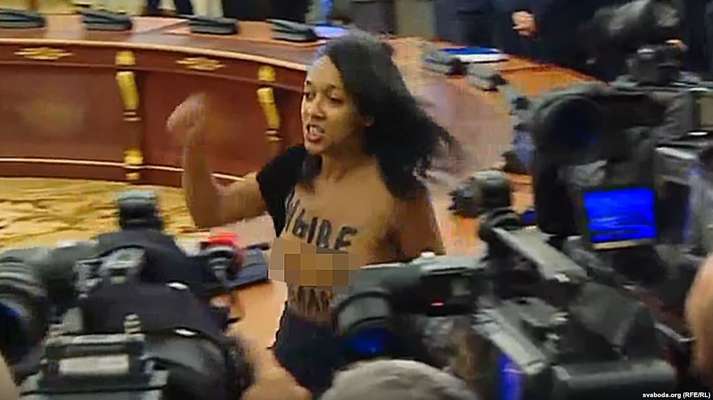 Урочисту зустріч президента України Петра Порошенка та президента Білорусі Олександра Лукашенка намагалася зірвати жінка, яка показала свої груди в будівлі Адміністрації і викрикувала «Живе Білорусь».
