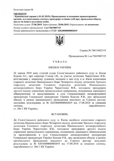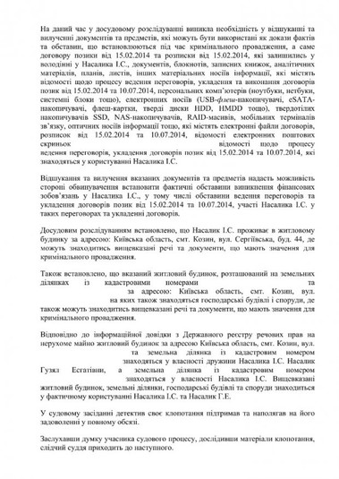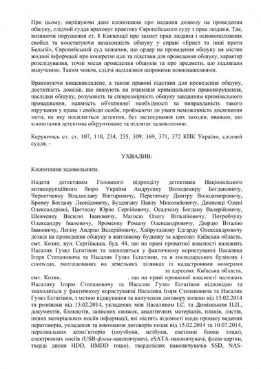 У журналістів опинився повний текст ухвали слідчого судді, яка надала дозвіл на обшук. З нього, зокрема, стає зрозуміло, що детективи НАБУ повинні були шукати в маєтку родини Насалика у Козині матеріали, що стосуються відразу двох боргових розписок міністра перед підприємцем, співвласником ФК «Карпати» Петром Димінським.