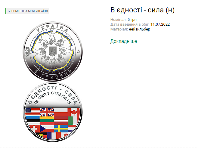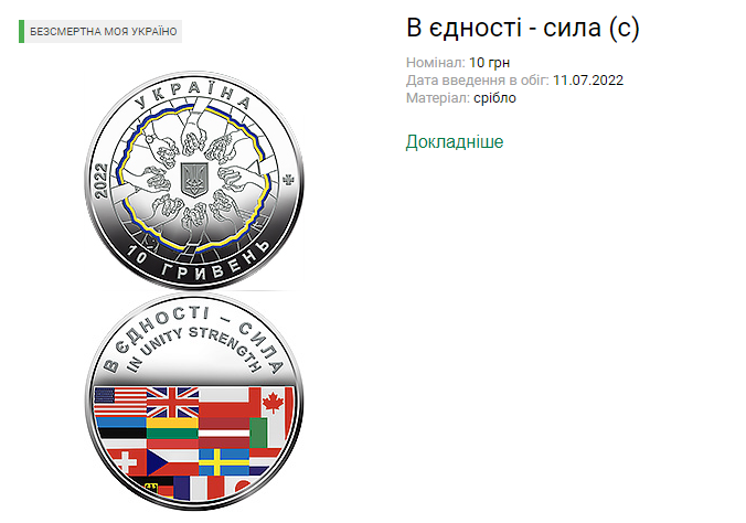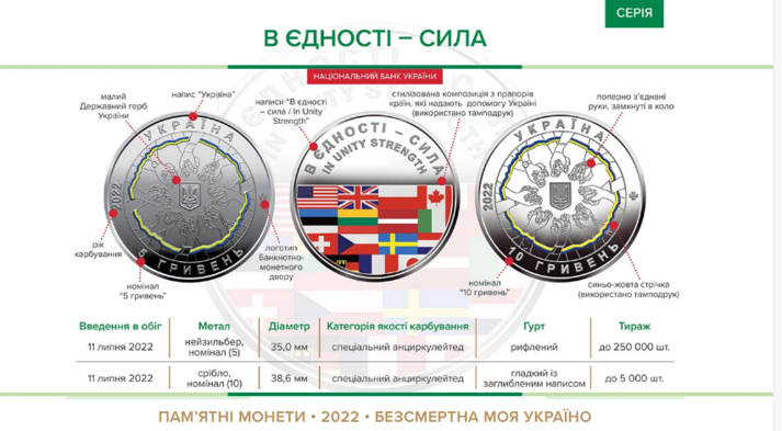 Національний банк України ввів у обіг пам’ятні монети «В єдності – сила», присвячені всенародному єднанню Українського народу у боротьбі проти російського агресора та міжнародній підтримці, яку Україні надає весь світ. Про це йдеться на сайті НБУ.