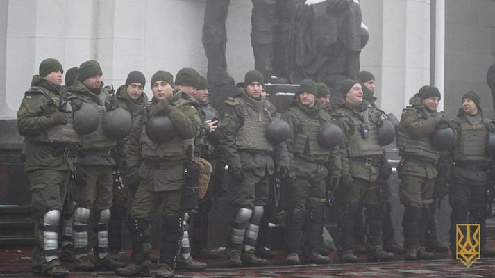 Представники «Національного корпусу» та «Національних дружин» прийшли до будівлі Верховної Ради, де о 16:00 має відбутись позачергове засідання Верховної Ради щодо розгляду питання введення воєнного стану в Україні.