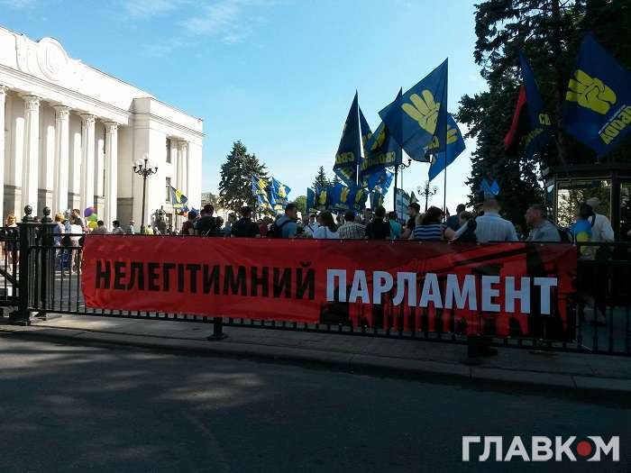 Під Верховною Радою тривають мітинги, учасники яких тримають в руках прапори і плакати з вимогами до народних депутатів.