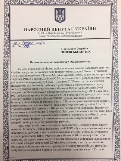 «Нагадаю, ще в січні Інститут молекулярної біології і генетики НАНУ розробив тест-систему для виявлення Covid-19, яка є дешевшою за іноземні аналоги. Проте запустити масове виробництво тестів не можуть через постійну затримку фінансування», – зазначив він.
