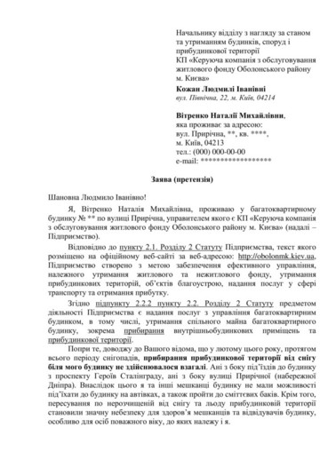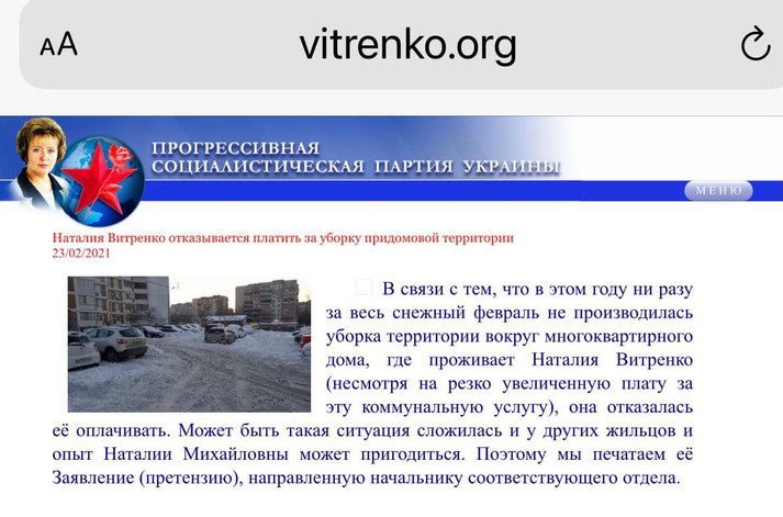 «У зв’язку з тим, що цього року жодного разу за весь сніжний лютий не проводилося прибирання території навколо багатоквартирного будинку, де проживає Наталія Вітренко (незважаючи на різко збільшену плату за цю комунальну послугу), вона відмовилася її оплачувати», – йдеться в повідомленні.