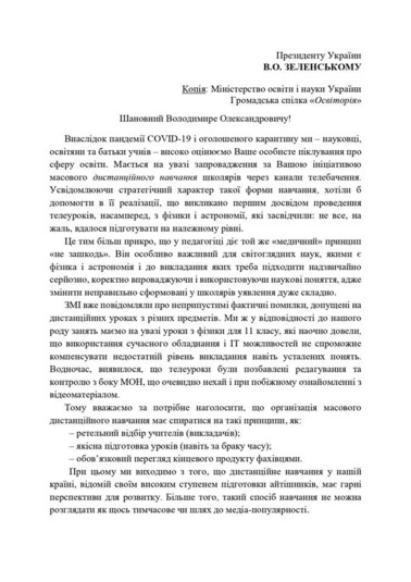 «З іншого боку, на диво швидко і в цілому ефективно організованими телеуроками розпочався, справді, грандіозний соціальний експеримент, завдяки якому ми отримали і позитивний досвід: коли вчителі з своїм наявним рівнем кваліфікації «вийшли з класу» в простір ТБ, перед нами постала досі прихована проблема реального падіння загальної професійної підготовки самих вчителів, особливо природничих дисциплін», - пишуть автори звернення.