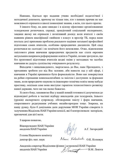 «Зі свого боку, запевняємо Вас у нашій повній готовності долучитися до відповідної роботи в частині відбору викладачів для телеуроків, їхнього (уроків) експертного супроводу, обговорення змісту і форм навчання, оперативного редагування учбових онлайн-програм тощо. Зокрема, на нашу думку, було б доцільним дати доручення МОН України створити із залученням Відділень НАН України комісії, які б контролювали матеріали, призначені для цієї мети», - йдеться у листі.