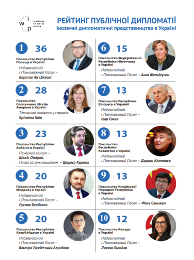 Надзвичайний і Повноважний Посол Польщі в Україні Бартош Ян Ціхоцкі та Надзвичайний і Повноважний Посол України у ФРН Андрій Мельник очолили «Рейтинг публічної дипломатії», складений Інститутом світової політики.