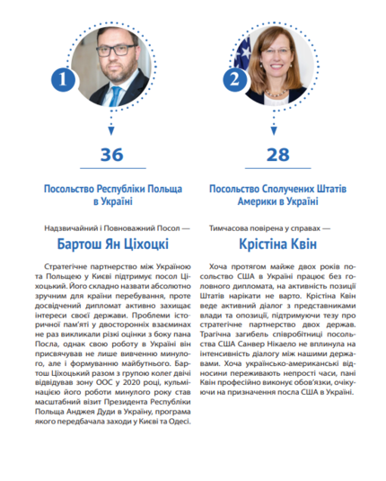 Отож Бартош Ян Ціхоцкі очолив рейтинг «Іноземних дипломатичних представництв в Україні». Він підтримує стратегічне партнерство між Україною та Польщею в Києві. Зокрема Ціхоцький разом із групою колег двічі відвідував зону ООС у 2020 році, кульмінацією його роботи минулого року став масштабний візит Президента Республіки Польща Анджея Дуди в Україну.