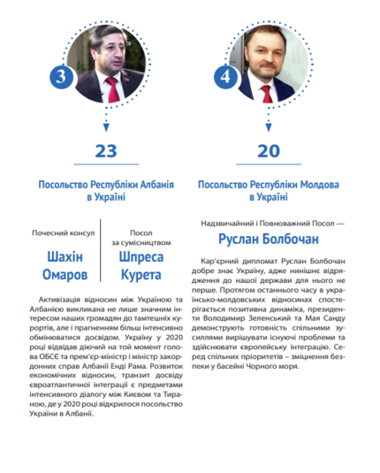 Трійку лідерів замикає Посольство Республіки Албанії в Україні на чолі із почесним консулом Шахіном Омаровим. Розвиток економічних відносин, транзит досвіду євроатлантичної інтеграції є предметами інтенсивного діалогу між Києвом та Тираною, де у 2020 році відкрилося посольство України в Албанії. Торік Україну відвідав чинний на той момент голова ОБСЄ та прем’єр-міністр і міністр закордонних справ Албанії Енді Рама.