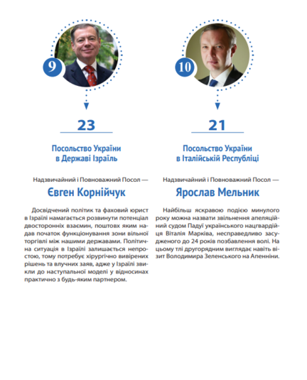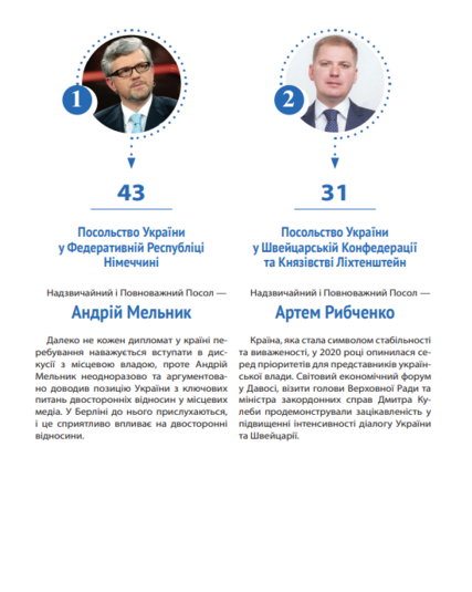 У рейтингу «Дипломатичні представництва України за кордоном» на першому місці Посольство України у Федеративній Республіці Німеччині на чолі з Андрієм Мельником. Він неодноразово доводив позицію України з ключових питань двосторонніх відносин у місцевих медіа. У Берліні до нього прислухаються, і це сприятливо впливає на двосторонні відносини.