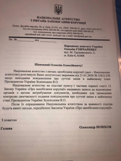 Національне агентство з питань запобігання корупції розглянуло звернення народного депутата з «Європейської солідарності» Олексія Гончаренка щодо порядку декларування витрат президента Зеленського на поїздку до Оману. Наразі НАЗК направило запити до відповідних органів з метою витребування документів, необхідних для проведення контролю щодо своєчасності повідомлення про суттєві зміни в майновому стані президентом Зеленським. Про це йдеться у відповіді НАЗК.