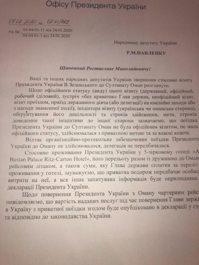 Щодо повернення президента України з Оману чартерним рейсом повідомляємо, що вартість наданих послуг під час повернення Глави держави в Україну з приватної поїздки згодом буде опубліковано в декларації у строк та відповідно до законодавства України».