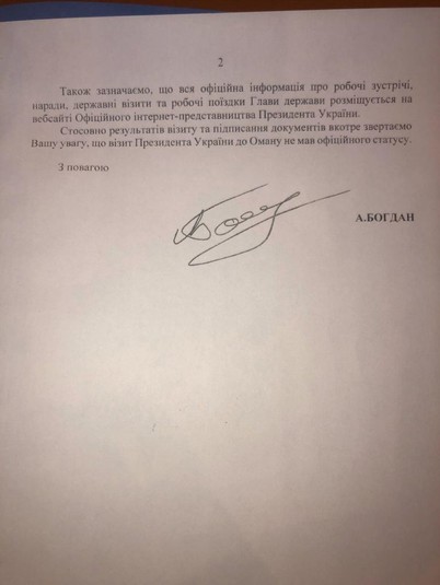 Стосовно проживання у 5-зірковому готелі Al Bustan Ritz-Carlton Hotel, його перельоту разом із дружиною до Оману рейсовим літаком, а також суми, які глава держави сплатив за проживання у готелі, то відповідно до листа за підписом Богдана, «приватна подорож передбачає особисті витрати на неї, а вся інша запитувана інформація буде оприлюднена у декларації президента України.