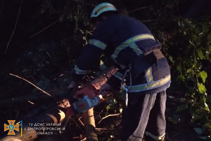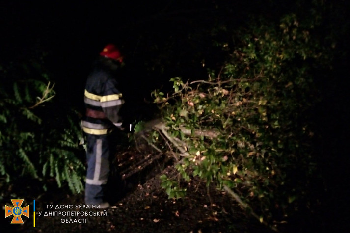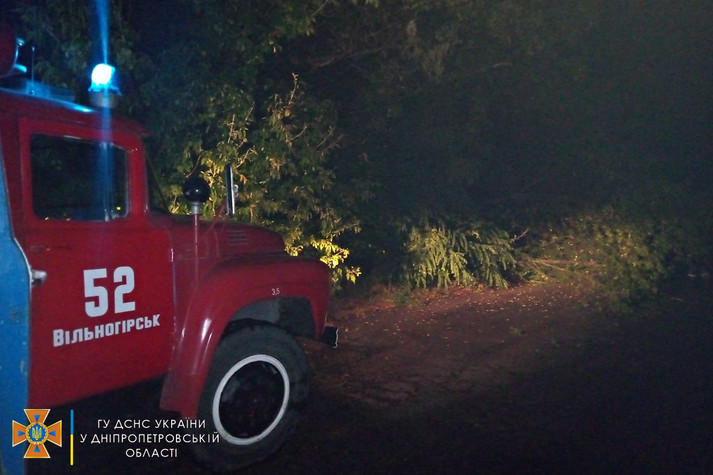 О 19:42 надійшло повідомлення про те, що на вулиці Тюльпановій міста Марганець Нікопольського району аварійне дерево впало на проїжджу частину дороги. По прибуттю до місця виклику бійці 33 державної пожежно-рятувальної частини розпилили та прибрали дерево», – зазначається у повідомленні.