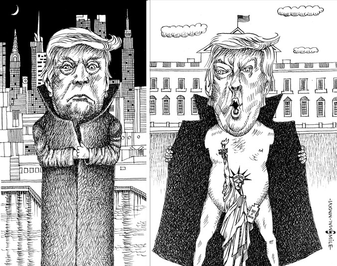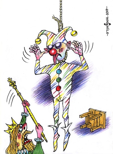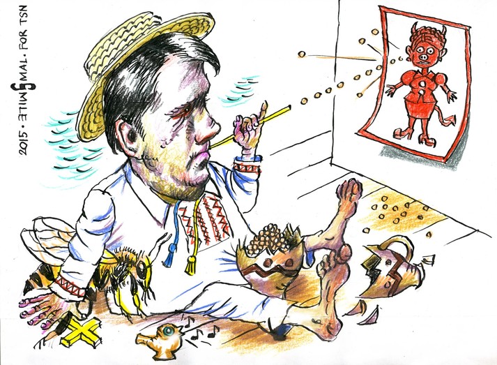 «Уявляєте, короткої липневої ночі я перегризаю дроти, щоб відімкнути бібліотечну сигналізацію, тягну драбину, підступно зриваю карикатуру на гаранта конституції. Ніхто не помічає такої наруги над президентом, хоча я, звісно, залишаю на місці злочину обгортки від шоколадних цукерок. І лише на відкритті виставки я по-ієзуїтськи починаю вимагати суду інквізиції. Масонський фейсбук робить з моєї замітки геометричну прогресію посилань. А ВВС додає мені ореол жертовного борця за свободу слова. Цікава версія. Але позаяк я давно не співпрацюю з українською пресою, то мої карикатури не приносять мені жодних доходів, і є лише моїм поглядом на навколишній світ, а не медіапродуктом, виготовленим на замовлення якоїсь редакції чи політсили», – резюмував Смаль.
