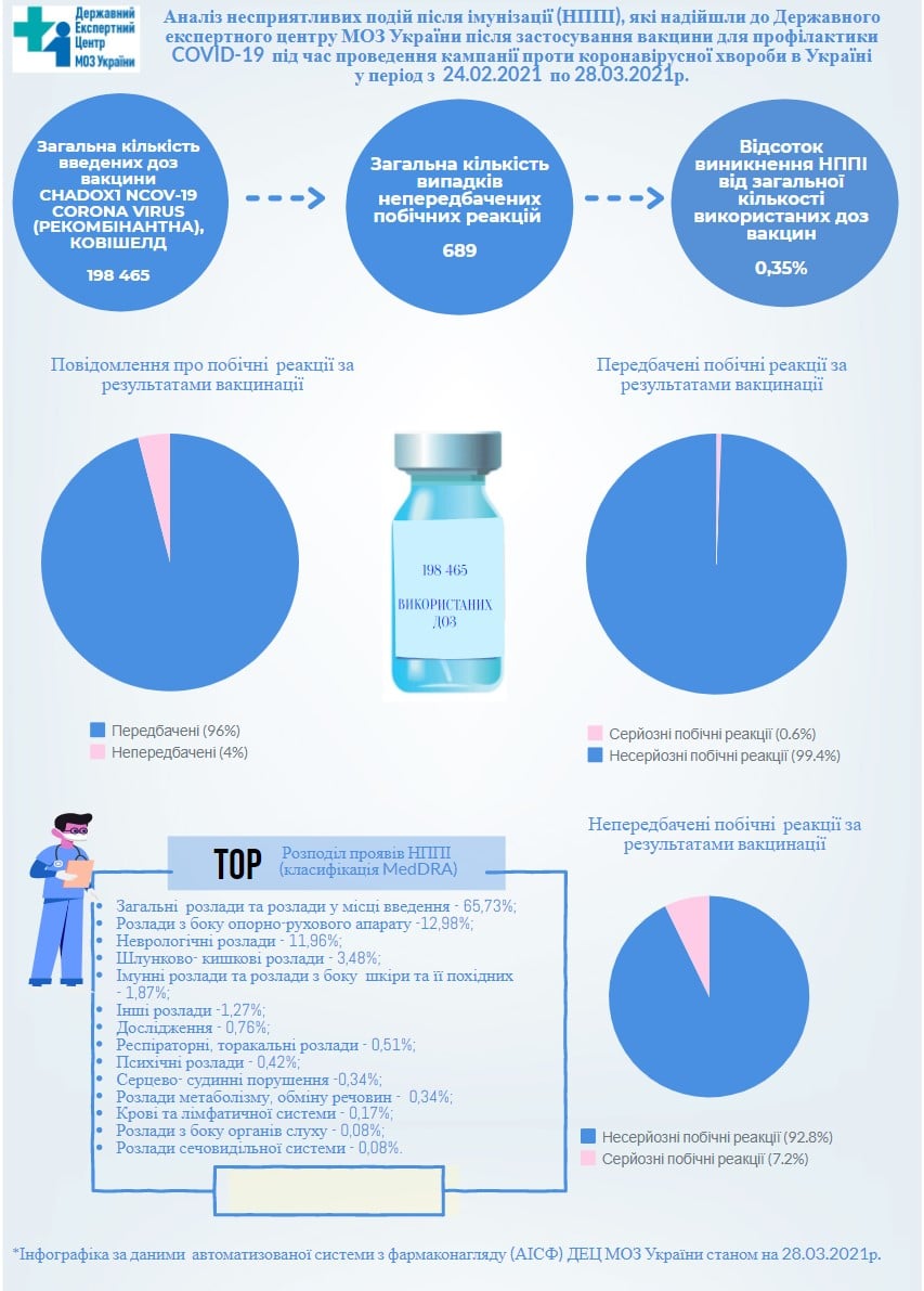 Експерти проаналізували побічні ефекти від щеплень від коронавірусу в період з 24 лютого по 28 березня. Після майже 200 тисяч доз щеплень відсоток побічних ефектів склав 0,35%.