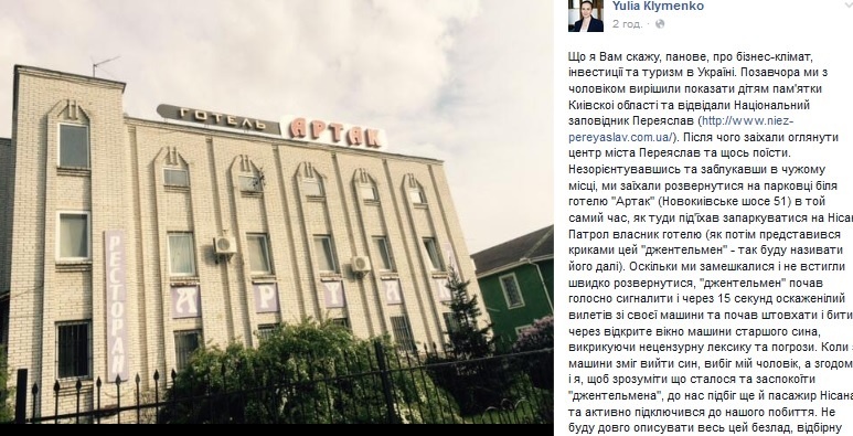 У п'ятницю, 6 травня, на парковці одного з готелів Переяслава-Хмельницького двоє чоловіків побили заступника міністра економіки Юлію Клименко, її чоловіка і старшого сина. Про цей інцидент вона повідомила в своєму Facebook.