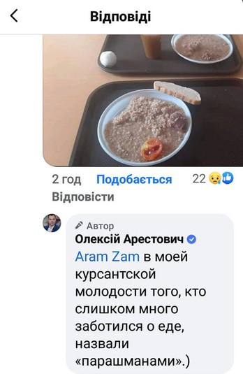 Арестович прокоментував фото харчів так: «У моїй курсантській молодості тих, хто дуже турбувався про їжу, називали «парашманами».