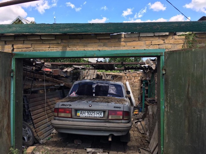 На фото видно зруйнований гараж, вибиті шибки разом із рамами, пробиті дахи
