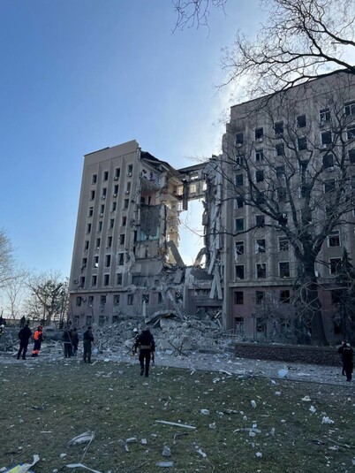 Внаслідок обстрілу сталося руйнування центральної секції будівлі з дев’ятого по перший поверх без подальшого горіння. За інформацією ДСНС, з-під завалів дістали дев’ять людей, яких передали медикам.