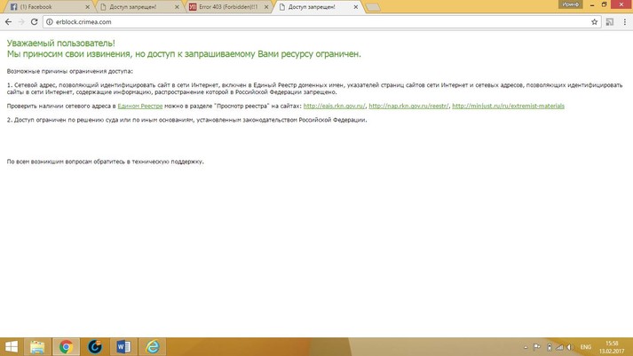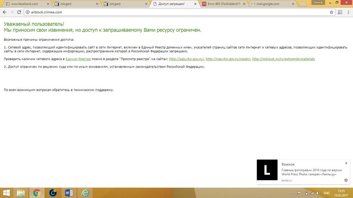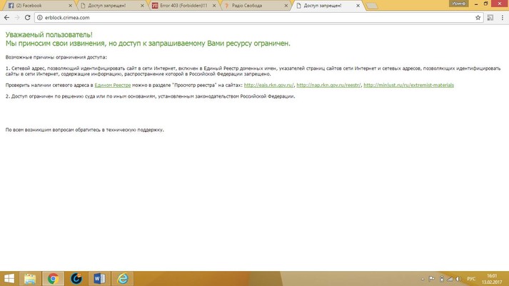 «Інтернет у Криму. Зайшла в кафе в центрі Сімферополя, підключилася до вай-фаю. Цензор.Нет, «Українська правда», «Громадське радіо», Крим.Реалії, сайт «15 хвилин», сайт телеканала АТР – заблоковані», – йдеться в повідомленні.