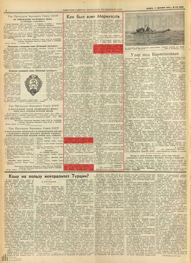 У газетах також йшлося про те, що по дорогах на захід від Маріуполя рухались колони німецьких машин. Ворог поспішав вивезти награбоване майно. Німці спалювали хліб на полях, а також розташовані у районі Маріуполя хутори та села