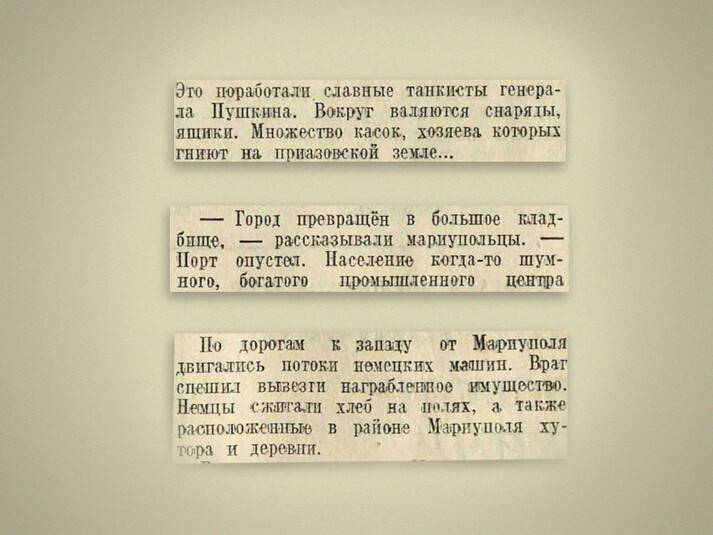 У газеті «Ізвєстія» наступного дня після вигнання нацистів із Маріуполя писали: Навколо валяються каски, власники яких гниють у приазовській землі.