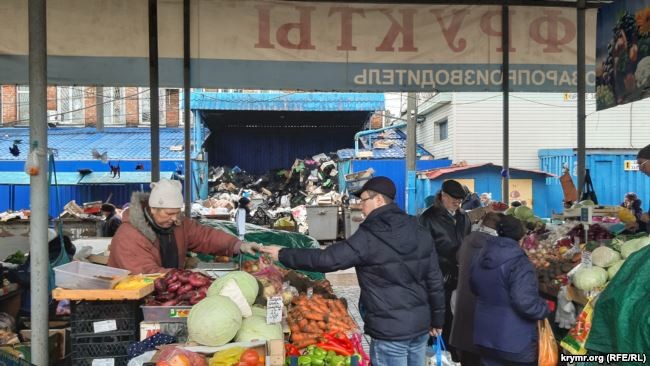 На центральному ринку Керчі гори сміття знаходяться поруч з торговими рядами, де торгують овочами та фруктами, а також поряд з корпусом, де продають молочні продукти.