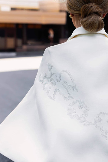 «Студія ARTEMKLIMCHUK відома увагою до деталей та поєднанням українських традицій із сучасною модою. Не став винятком і одяг першої леді. Для оформлення рукавів сукні та кейпа майстри з вишивки використовували традиційні українські артизанальні техніки, адаптуючи флористичні й анімалістичні мотиви з килимів Сумщини та Полтавщини початку ХІХ сторіччя. Розташування елементів на кейпі натхненне символізмом стародавнього Трипілля», - розповіли в прес-службі.
