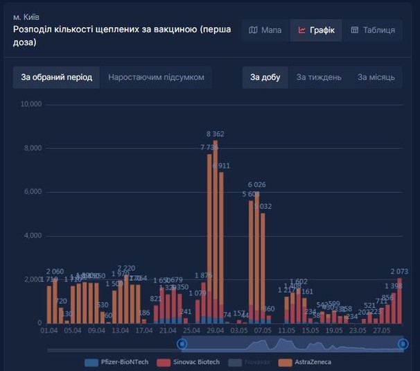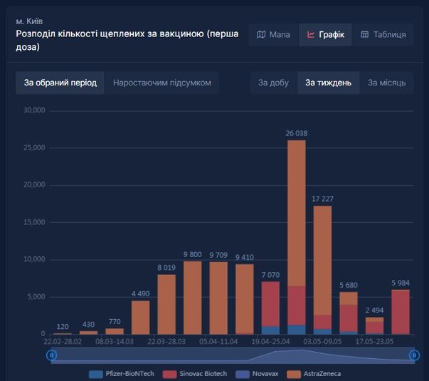 «Якщо в перший тиждень травня було 17,2 тисяч вакциновано, то в другий тиждень 5,6 тис, в третій взагалі 2,5 тис, на четвертий тиждень 6 тис осіб. Якщо додати вакцинацію другий дозою то картинка по Києву буде наступна: