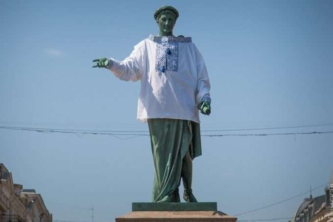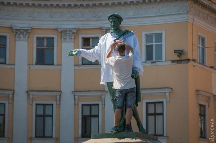 Напередодні дев’ятого Вишиванкового фестивалю в Одесі пам’ятник одеському градоначальнику Арману-Еммануелю де Рішельє одягнули у традиційне українське вбрання.