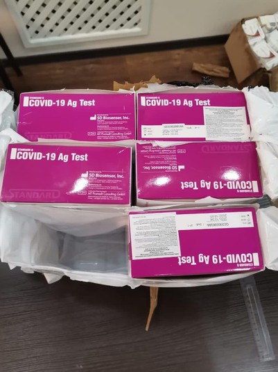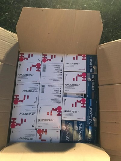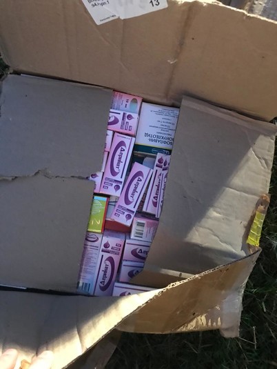 Зазначається, що у 12 картонних ящиках було виявлено велику кількість медичних засобів, у тому числі і Covid-тестів.