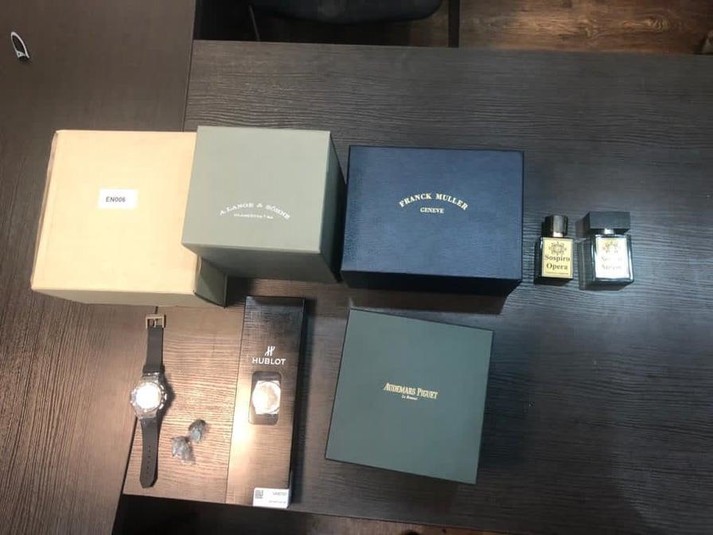 «Також в одному з ящиків знайдено два швейцарських годинники класу «люкс» – «Hublot», ексклюзивні чоловічі запонки швейцарської компанії «Patek Philippe», два флакони парфумів «Accento Sospiro» та «Sospiro Opera», а також чотири футляри для зберігання елітних годинників», ─ повідомляють прикордонники.
