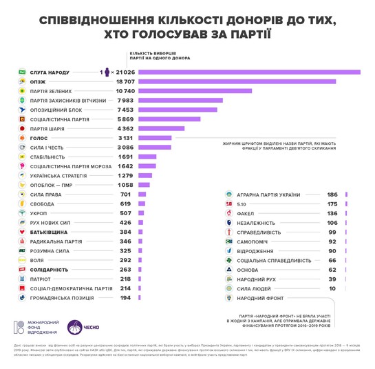 «Проаналізувавши звіти, ми нарахували 19 649 осіб, які давали гроші політикам. Але ця кількість не точна. Похибку створили самі партії. У багатьох звітах є помилки, пропущені або написані абревіатурами імена донорів. В Україні, не враховуючи окупованих територій, мешкає 30,1 мільйона виборців. Таким чином, партії і національні виборчі кампанії фінансує лише один із півтори тисячі виборців, або ж менше 0,07% (сім сотих)», - заявили активісти «Чесно».