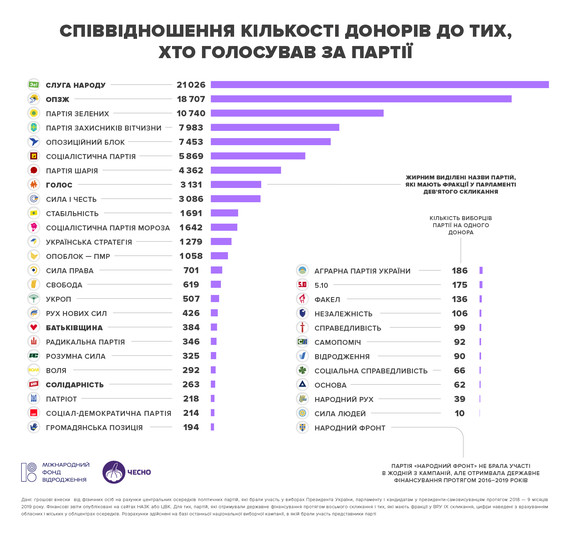 Також повідомляється, що у 13 із 37 партій донорів менше за виборців у тисячі разів. До прикладу, лише один з 21 000 виборців «Слуги народу» фінансує партію. І це не дивно, адже на сайті партії немає реквізитів для її фінансування, а найменший внесок становить 20 тисяч гривень.