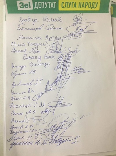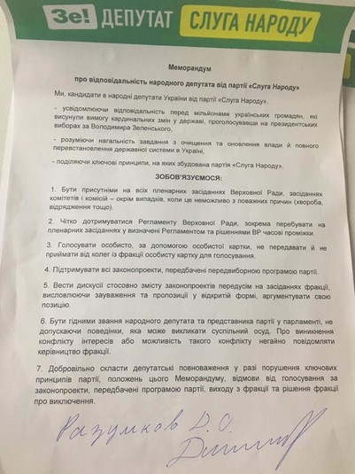 Кандидати у народні депутати від партії «Слуга Народу» підписують Меморандум про відповідальність, повідомляє політ сили у себе на сторінці у Facebook.