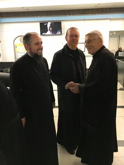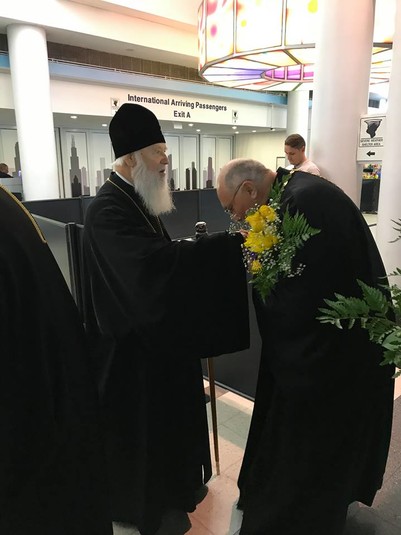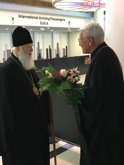 На летовищі Патріарха зустрів настоятель парафії св. Андрія Первозванного УПЦ КП в Блумінгдейл шт. Іллінойс протоієрей Віктор Полярний, секретар Вікаріату, голова Управи громади Іван Яресько, священики та представники громад Вікаріату.