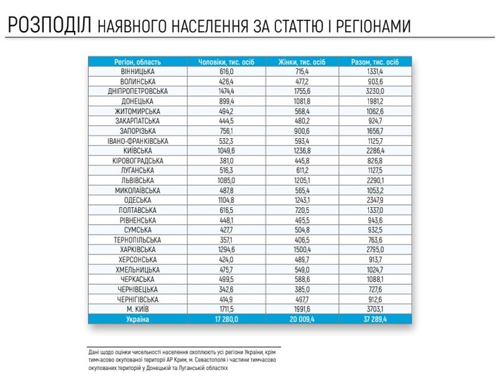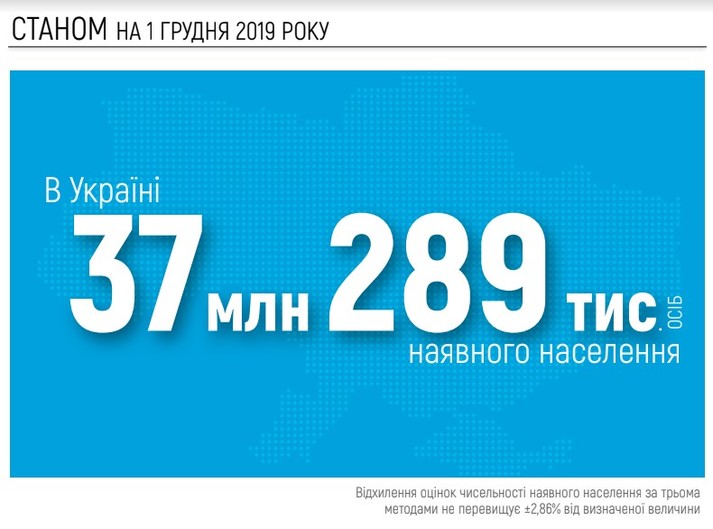 «Три методики дали приблизно однаковий результат - 37 млн 289 тисяч осіб наявного населення на території України. На жаль ця сума не включає людей, які постійно мешкають за кордоном та на окупованих територіях… станом на 1 грудня 2019 року», - сказав Дубілет.