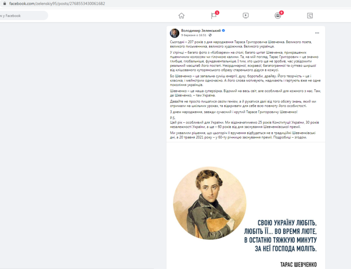 Президент України Володимир Зеленський зробив допис у соцмережі Facebook до дня народження Тараса Григоровича Шевченка. Також очільник держави запостив портрет молодої людини, очевидно думаючи, що то – юний Тарас. Про це написав журналіст Василь Зима на своїй сторінці в мережі Facebook.
