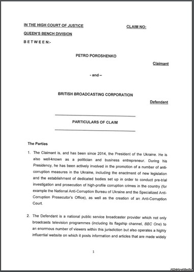 Суд королівської лави Високого суду Англії та Уельсу надіслав на запит «Радіо Свобода» деталі позову Петра Порошенка проти британського суспільного мовника BBC.
