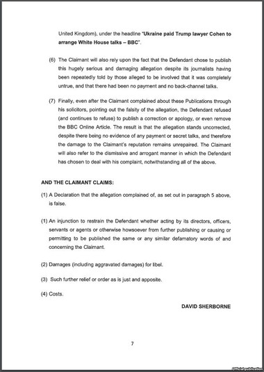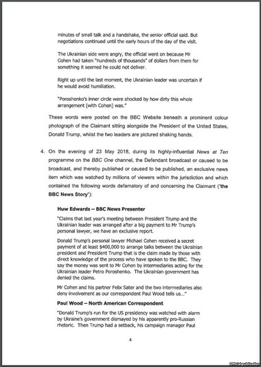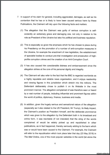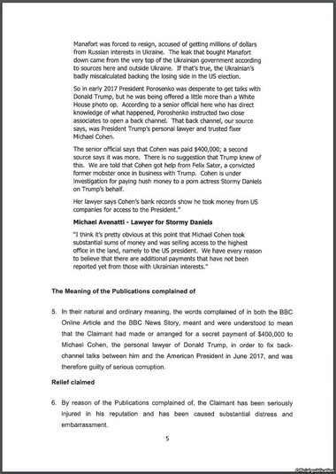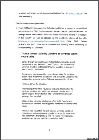 Згідно з документом, позов стосується статті, яку опублікувало BBC від 23 травня 2018 року під назвою «Юристу Трампа «Україна заплатила» за організацію зустрічі в Білому Домі». Статтю прочитали «мільйони читачів в цій країні і за її межами».
