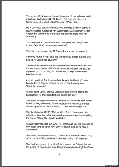 В статті журналіст стверджує, що юрист президента Сполучених Штатів Дональда Трампа Майкл Коен отримав як мінімум $400 тисяч за те, що влаштував зустріч президента Петра Порошенка з Трампом. Автор посилається на свої джерела в Києві, «наближені до причетних до справи».