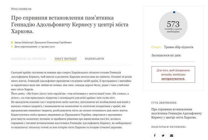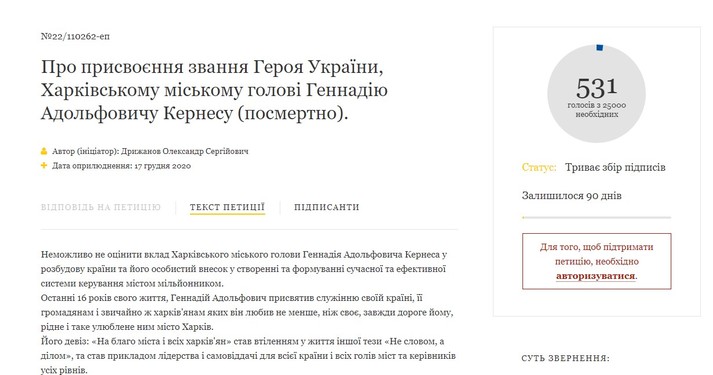 Харківський адвокат Олександр Дрижанов пропонує президенту України Володимиру Зеленському присвоїти (посмертно) звання Героя України меру Харкова Геннадію Кернесу, а також посприяти у встановленні йому пам’ятника. Обидві петиції за добу набрали понад 500 голосів.