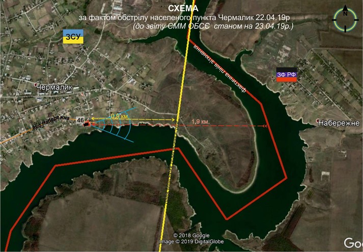 На вулиці Набережній, 46 у Чермалику, приблизно за 300 метрів на захід від лінії зіткнення, спостерігачі побачили сліди на стіні цегляної господарської будівлі, розташованої за 15 метрів від житлового будинку. За оцінкою представників Місії, пошкодження виникли внаслідок вогню зі стрілецької зброї. Поряд із цією будівлею спостерігачі зафіксували згорілі залишки дерев'яної господарської споруди. Власник будинку повідомив СММ про те, що ввечері, перебуваючи в оселі, він почув постріли зі стрілецької зброї, а після побачив, що палає дерев'яна споруда.