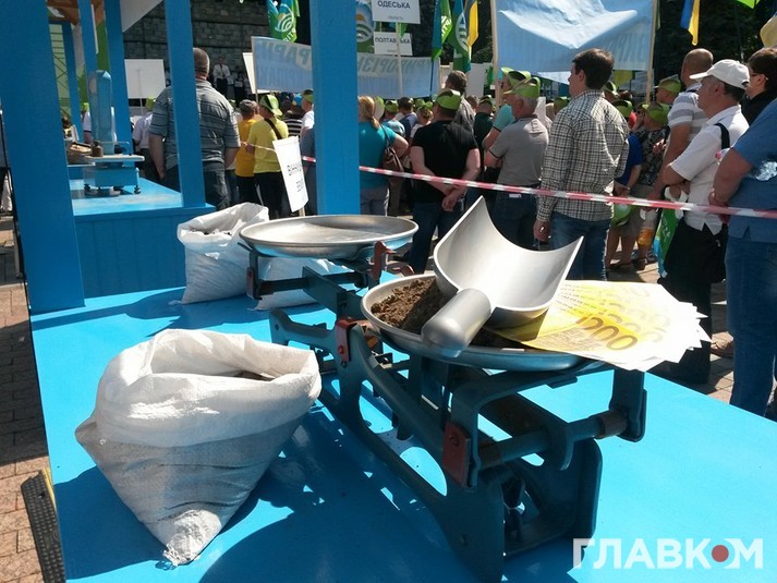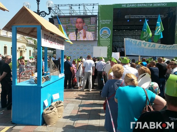 О 9:30 на площі Конституції розпочався флеш-моб «Український базар», під час якого депутати з торгових яток продаватимуть українську землю.