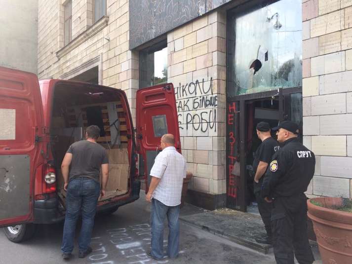 Магазин «Емпоріум» на Грушевського, на фасаді якого знищили патріотичні графіті часів Майдану, з'їжджає з приміщення. Про це повідомляє «Четвертая власть» з місця події.