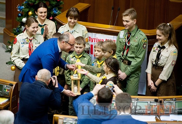 У Верховну Раду представники Національної скаутської організації України «Пласт» принесли Вифлеємський вогонь. Про це повідомляє «Цензор.нет».