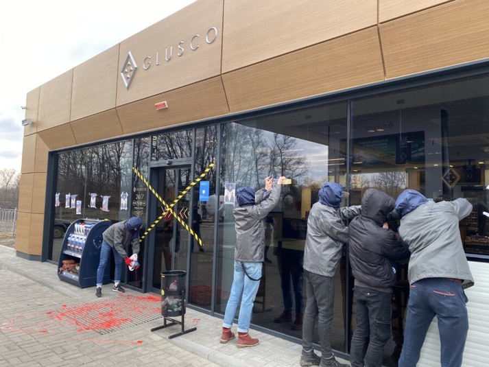 Так, у Харкові, Львові, Херсоні, Миколаєві, Полтаві, Олександрії активісти заклеїли двері сигнальною стрічкою та приклеїли до фасаду АЗС плакати із написами «СБУ, давай закривай спонсорів тероризму!», «Спонсоруємо окупантів. Відмиваю російські гроші». Крім того, на вході до АЗС розлили червону фарбу.